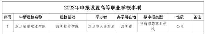 此前,广东省教育厅发布《关于2023年度申报设置高等职业学校事项的公示》,申报以深圳技师学院为基础设立深圳城市职业学院。