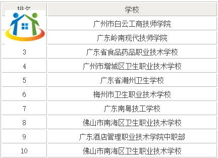 广州市白云工商技师学院、广东岭南现代技师学院、广东省食品药品职业技术学校、广州市增城区卫生职业技术学校、广东省潮州卫生学校、梅州市卫生职业技术学校、广东南粤技工学校、佛山市南海区卫生职业技术学校、广东酒店管理职业技术学院中职部、佛山市南海区卫生职业技术学校。