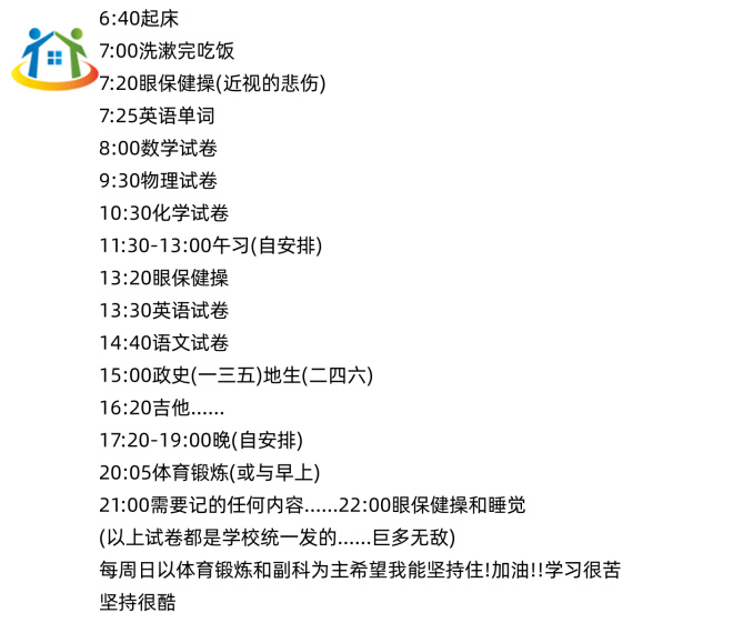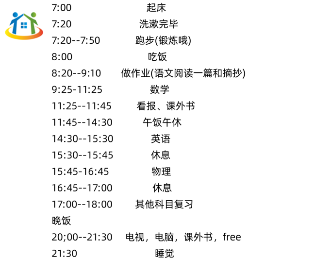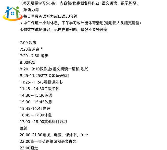 所以,在假期第一周,趁着学习的余韵还未散退,年味儿还没有那么浓,应以学习为主,完成部分寒假作业。其他安排也应与学习相关,制定好寒假的学习生活计划。