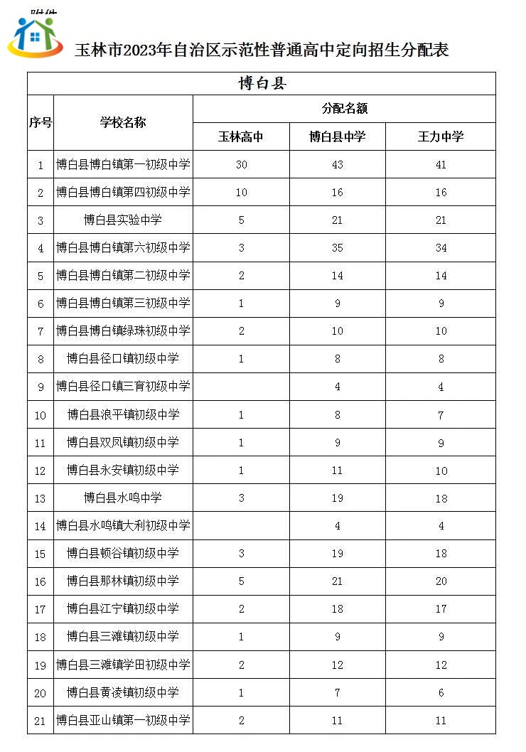 以上是“初升高必看!博白县2023年示范性普通高中招生分配计划表”的全部内容,内容仅供大家参考,中专中职生还想了解更多关于广西中专中职资讯,敬请关注广西初中升学网。