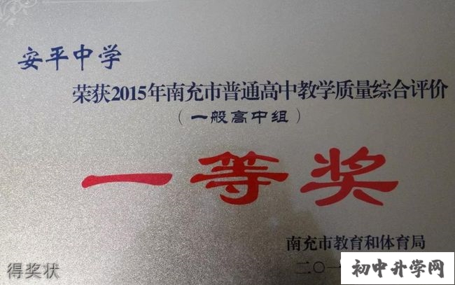 南充市安平中学建校以来在老师和学生的共同努力下,取得一个又一个惊人佳绩,获得过“南充市文明单位”、“南充市卫生先进单位”、“南充市教育科研先进单位”,连续十年勇夺“南充市高中办学水平一等奖”,连续十年续写纯应届生上重点本科线的教育神话。