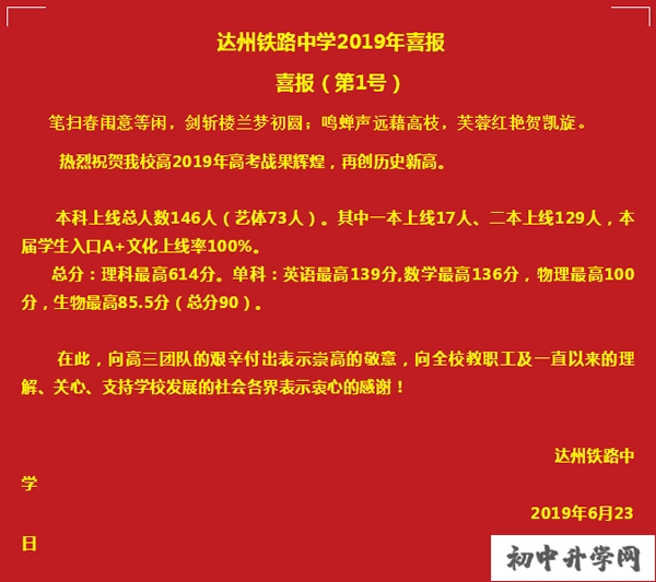 2020年达州市中考成绩现已揭晓,继去年我校创中考历史新高之后,今年铁中再一次不负众望,中考成绩全面告捷,喜报频传,又创新佳绩,再续新辉煌。为此,我们怀着抑制不住的喜悦,向社会及各位家长报喜。
