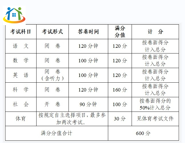 (三)初中学业水平考试科目、考试形式、答卷时间、满分分值、计分方式如下:
