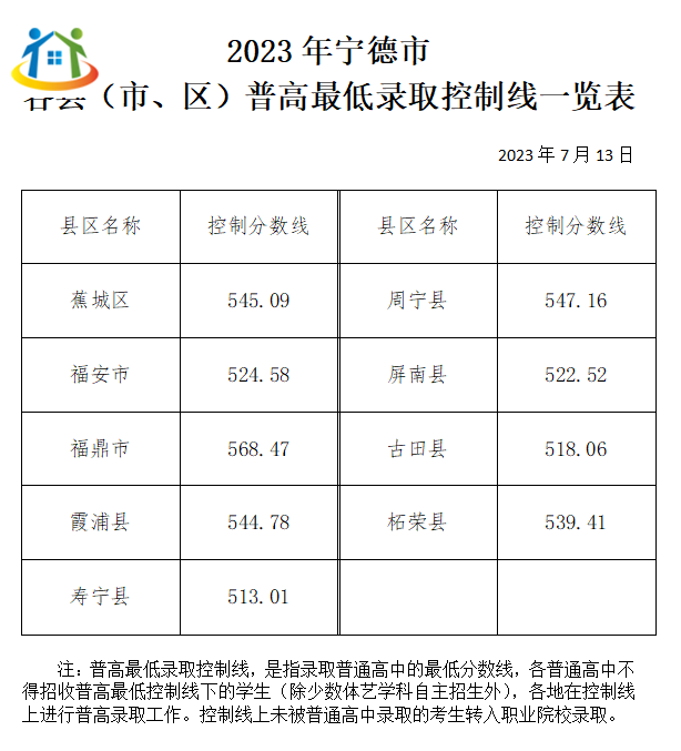 根据宁德市中考中招日程安排,现将2023年宁德市各县(市、区)普高最低录取控制分数线公布如下: