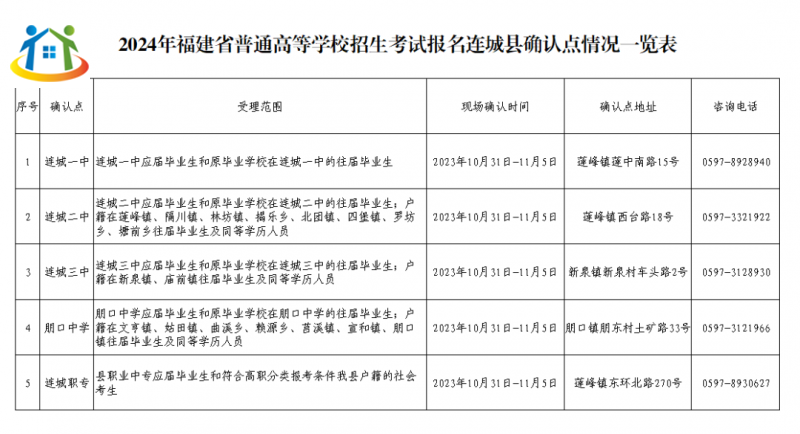 六、2024年福建省普通高等学校招生考试报名连城县确认点一览表
