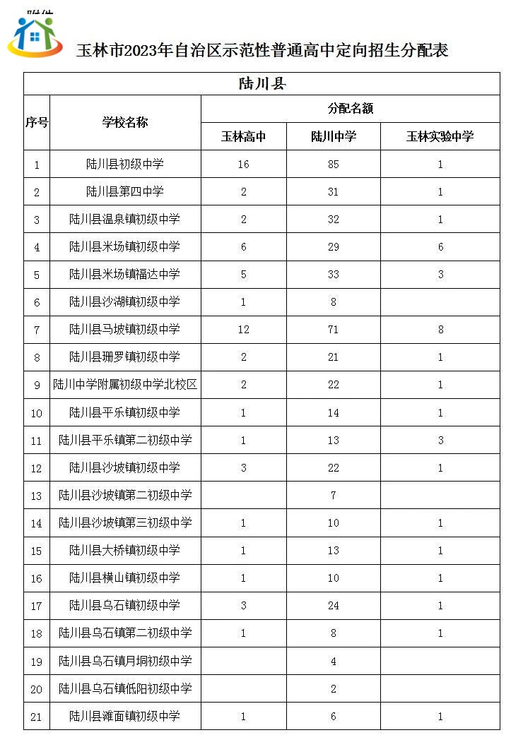 以上是“初升高必看!陆川县2023年示范性普通高中招生分配表”的全部内容,内容仅供大家参考,中专中职生还想了解更多关于广西中专中职资讯,敬请关注广西初中升学网。