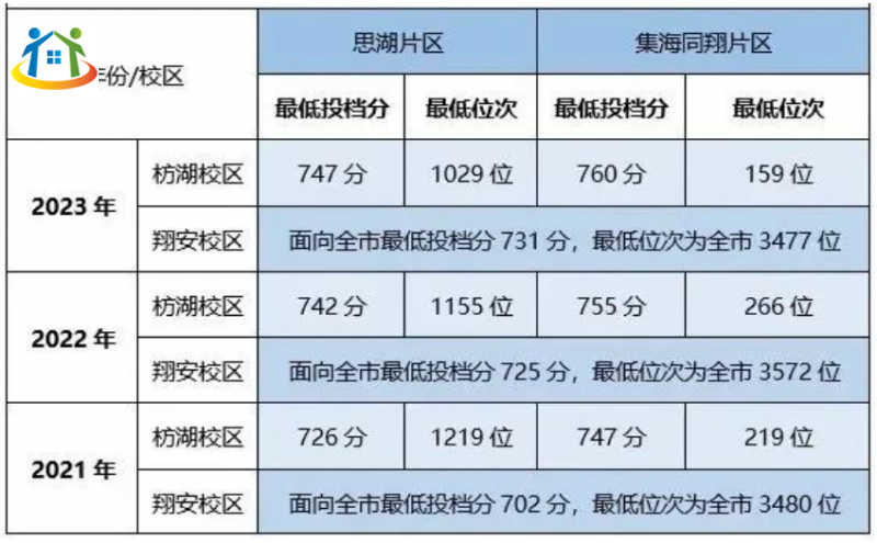 枋湖校区:思湖片区平均最低投档分为738分,平均最低位次为1134位;集海同翔片区平均最低投档分为754分,平均最低位次为214位