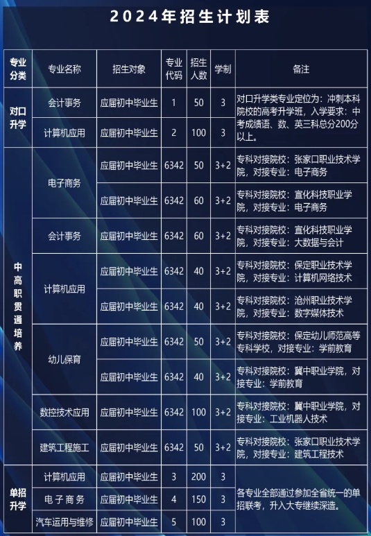 尊敬的各位家长、全体初中应届毕业生:根据《河北省教育厅关于做好 2024年中等职业学校招生工作的通知》,高碑店市职教中心2024年秋季招生