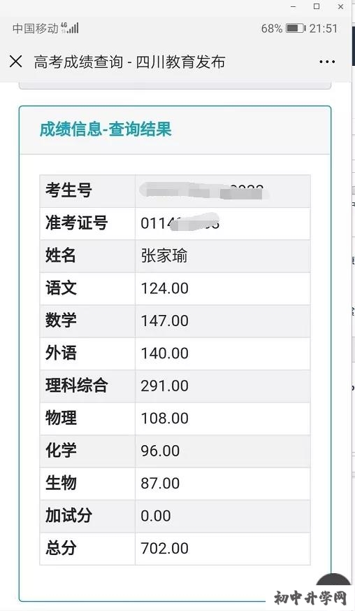 刚刚消息,2020年四川高考,成都七中实验学校张家瑜同学理科702分!