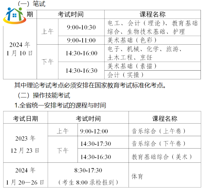 2024年第一次专业技能课程考试开考课程为:《电工》《电子》《机械》《化学》《会计》《旅游》《美术基础》《教育基础综合》《音乐综合》《土木工程》《生物技术基础》《护理》《烹饪》和《体育》共14门课程,其中《音乐综合》《美术基础》和《体育》3门课程不考理论,只考操作技能;《土木工程》只考理论,不考操作技能。