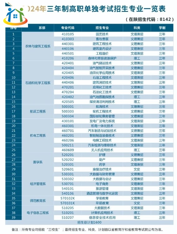 2024年延安职业技术学院单招专业一览,内容包含各专业招生代码、科类、学制、以及招生计划总数,希望能给想要继续升学的小伙伴或
