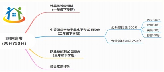 (2)“职教高考”有别于普高生的“夏季高考”,它改变了夏季高考的一考定终身的现状,通过“两年两考”的方式来完成,总分为750分。“两年两考”指二年级下学期考一次(即“学考”,安排在每年的6月20日左右),三年级下学期考一次(即“技能测试”,安排在每年的3月底至4月初)。“两年两考”的成绩相加后,按照不同专业进行全省排名,作为中职学生录取本科及大专院校的主要依据具体考试科目、时间、分值详见下表: