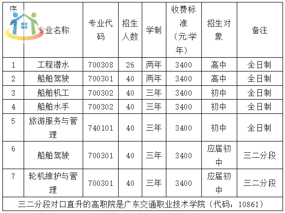 2023年广州潜水学校与广东交通职业技术学院三二分段招生计划